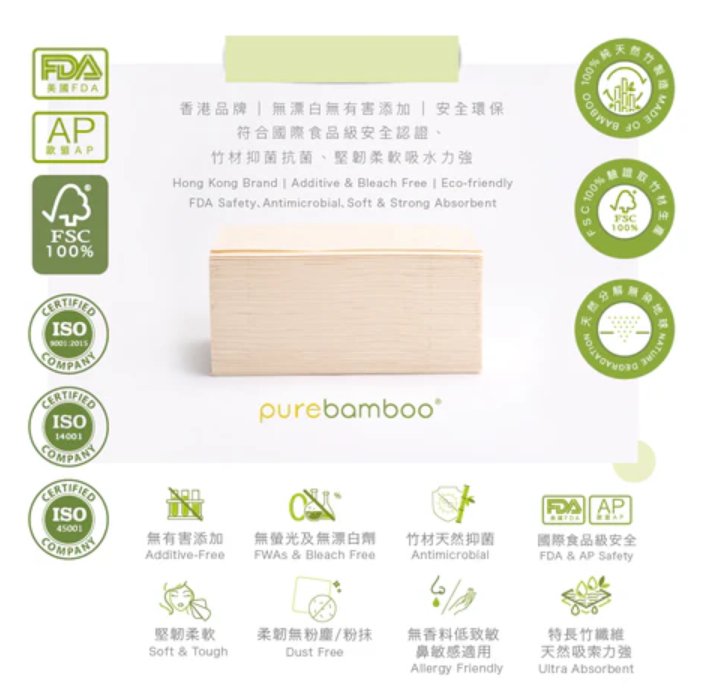 香港獲獎環保品牌|純天然100%竹漿製造以竹代木 原色竹紙 健康安全 無染地球‧ 天然竹琨抑菌‧ 無漂白、增白劑及香料‧ 無添加有害化合物致癌物‧ FSC100%受監管竹林取材‧ 符合FDA食品級安全認證‧ 經高溫蒸煮消毒製造‧ 無粉塵、堅韌柔軟‧ 吸油吸水力強