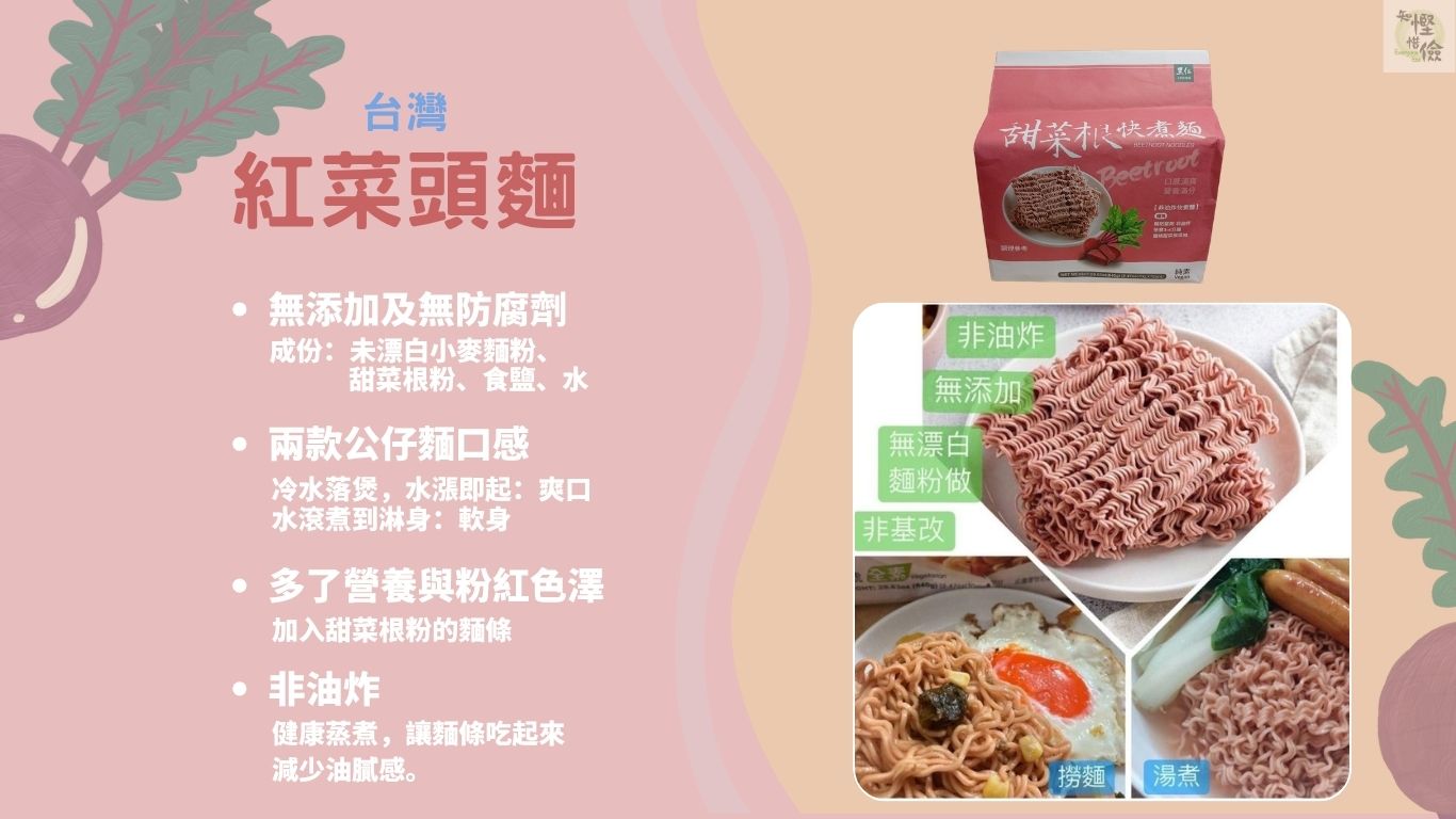 甜菜根快煮麵是一款無添加化學物、防腐劑的天然健康麵食,主要成分為未漂白小麥粉與甜菜根粉,呈粉紅色澤。採用蒸煮非油炸工藝,只需沸水快煮3分鐘,口感爽滑Q彈,適合做成湯麵或拌麵,是注重健康者的熱門選擇。
